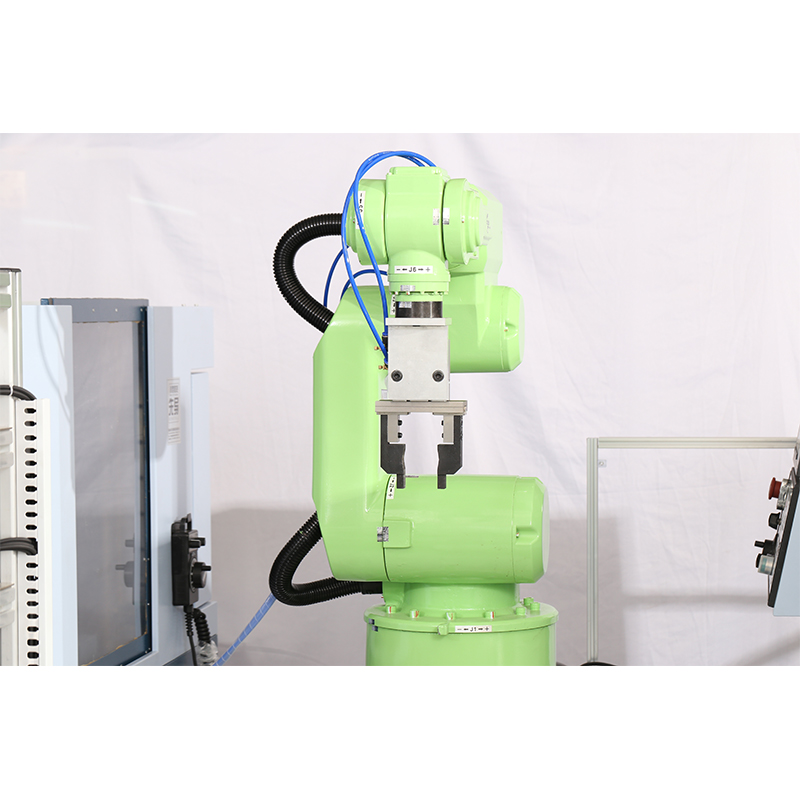 由(yóu)一台工(gōng)業6軸自(zì)由度機器人、一台三坐標機械(xiè)手臂(bì)、一台柔性數控車床、一台柔性數控銑床、RFID係統(tǒng)、PLC工作站、智能倉庫、中控台、傳(chuán)輸(shū)帶等部(bù)份組成,實現自動化上下(xià)料、加工等無人工作環節,機器人按指令分別給(gěi)兩台機器送料取(qǔ)料;該係統能夠實現工業機器(qì)人(rén)上下料工作站係統的編程、上下料係統的集成、RFID係統應用、PLC係統(tǒng)編程、數控車床編程加工、數控銑床編程加工、現(xiàn)場總線的通訊實訓等環節。讓學生輕鬆掌握工業6軸機器(qì)人上下料與數控機床組建柔性加工生產係統,能滿(mǎn)足學生(shēng)對工業機器人學(xué)習及操作(zuò)的需要,學生通過該套係統的學習與訓練,對智能生產無人工廠的組建整體性應用有全麵的了解與體驗。